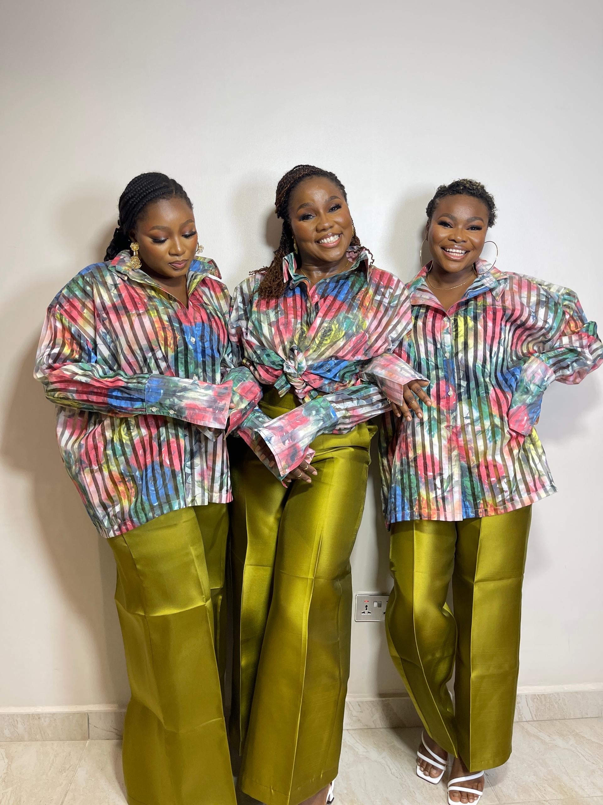 this two-piece set is a true statement-maker. The multicolored pleated shirt features an artistic print with playful stripes and florals, designed with a relaxed fit that can be styled tucked, knotted, or left loose. Paired with luxurious satin wide-leg trousers in a rich olive green, the look strikes the perfect balance between elegance and flair.