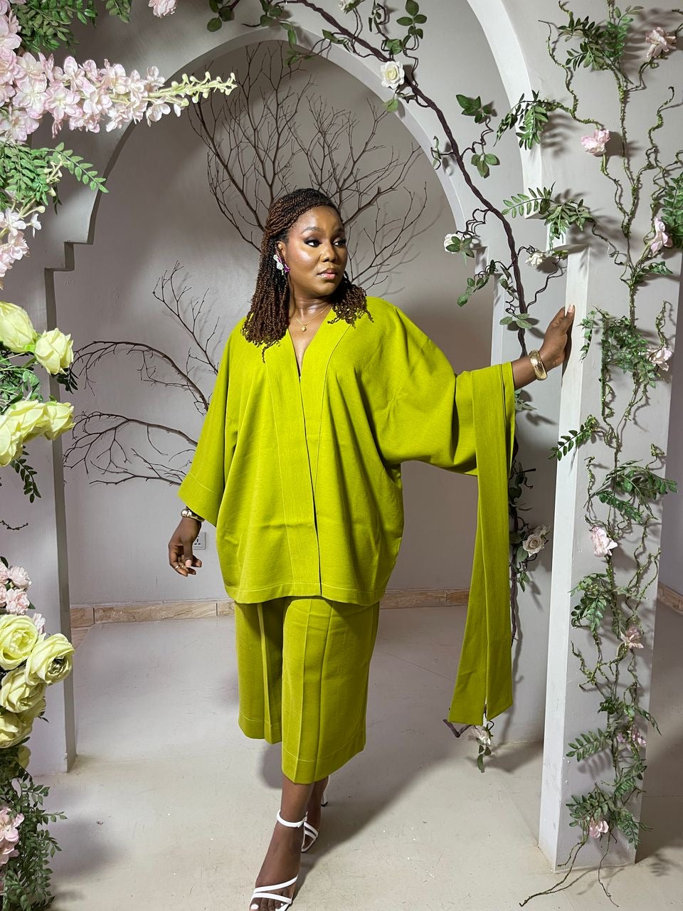 - Bottom: Tailored culotte pants with structured seams that give definition while maintaining comfort.