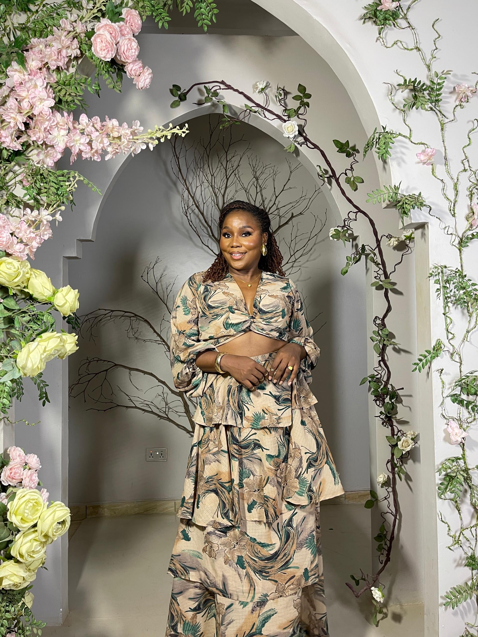 The top features a flattering twisted front detail with long puff sleeves, adding a stylish touch to the cropped silhouette. The matching skirt flows beautifully with tiered layers, creating movement and grace with every step. Designed in earthy tones with green and beige floral patterns, it’s a versatile look that works for both casual and special occasions.