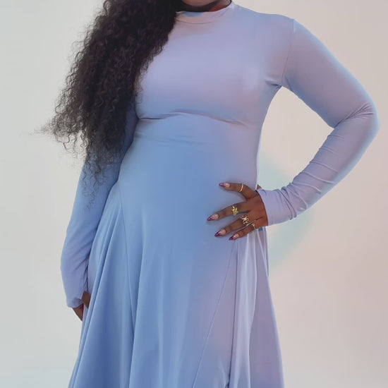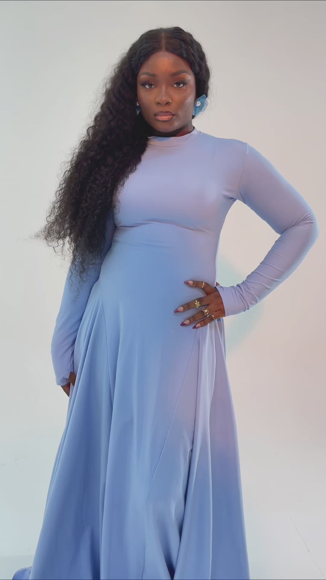 this sky-blue maxi dress is designed to make a graceful statement. The figure-skimming bodice features a high neckline and fitted long sleeves, balancing sophistication with comfort. Flowing into a full-length skirt, the silhouette creates beautiful movement with every step, perfect for both formal and evening occasions.