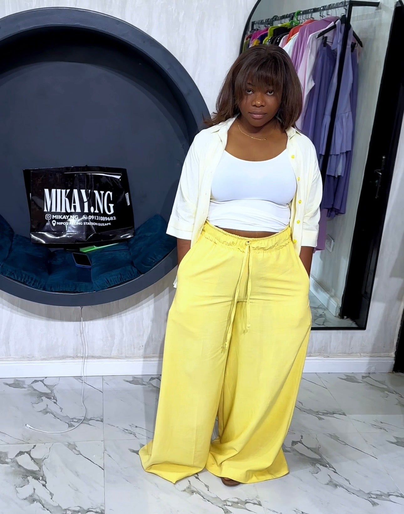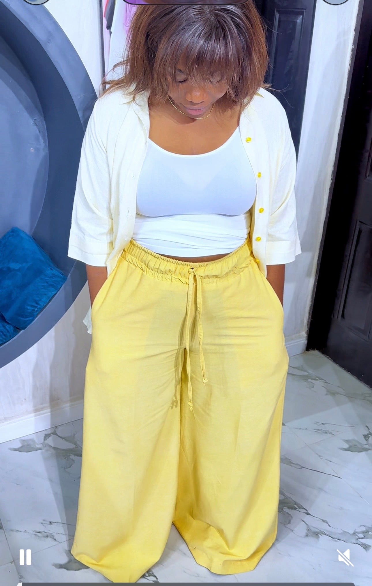 - Bottom: Flowing wide-leg trousers in a soft, sunny yellow, designed with a drawstring and elasticated waistband for an easy, flattering fit.